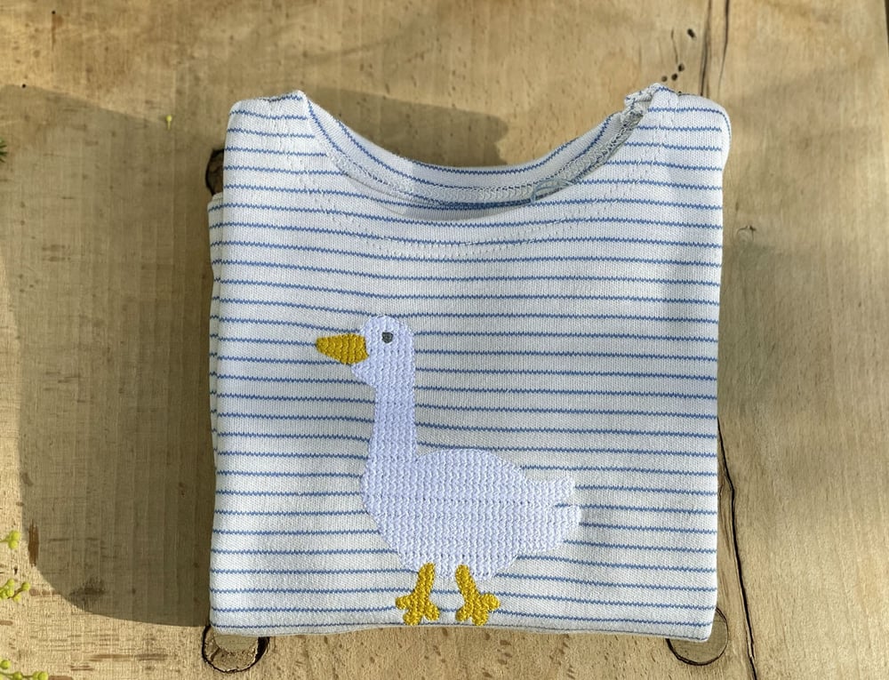 hellgrau-blau gestreiftes T-Shirt mit einer gestickten Gans