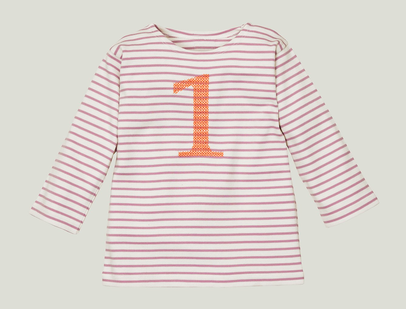 Flieder gestreiftes T-Shirt mit einer gestickten neon orange farbenen Jahreszahl in Kreuzstich -neuer Schnitt!