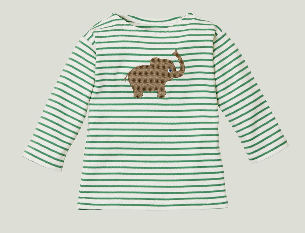 grün gestreiftes T-Shirt mit einem gestickten Elefanten