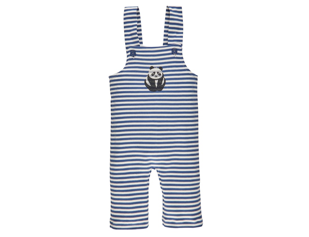 blau gestreifte Latzhose mit einem gestickten Panda Bären
