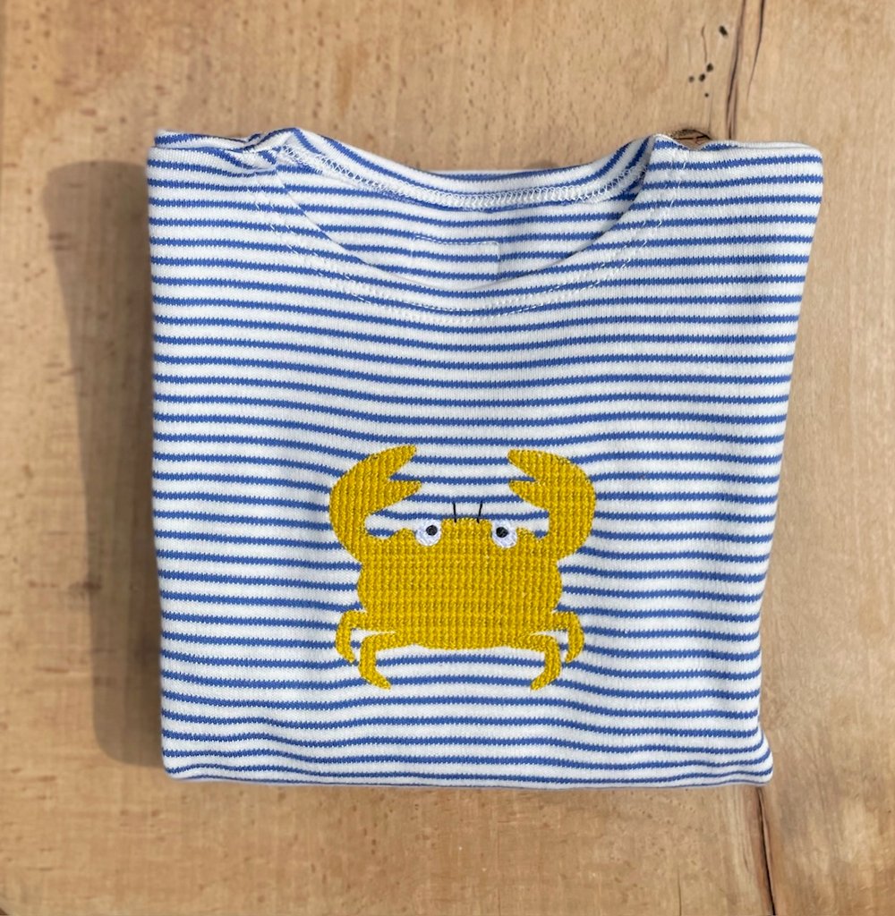 blau gestreiftes T-Shirt mit einem gestickten Krebs