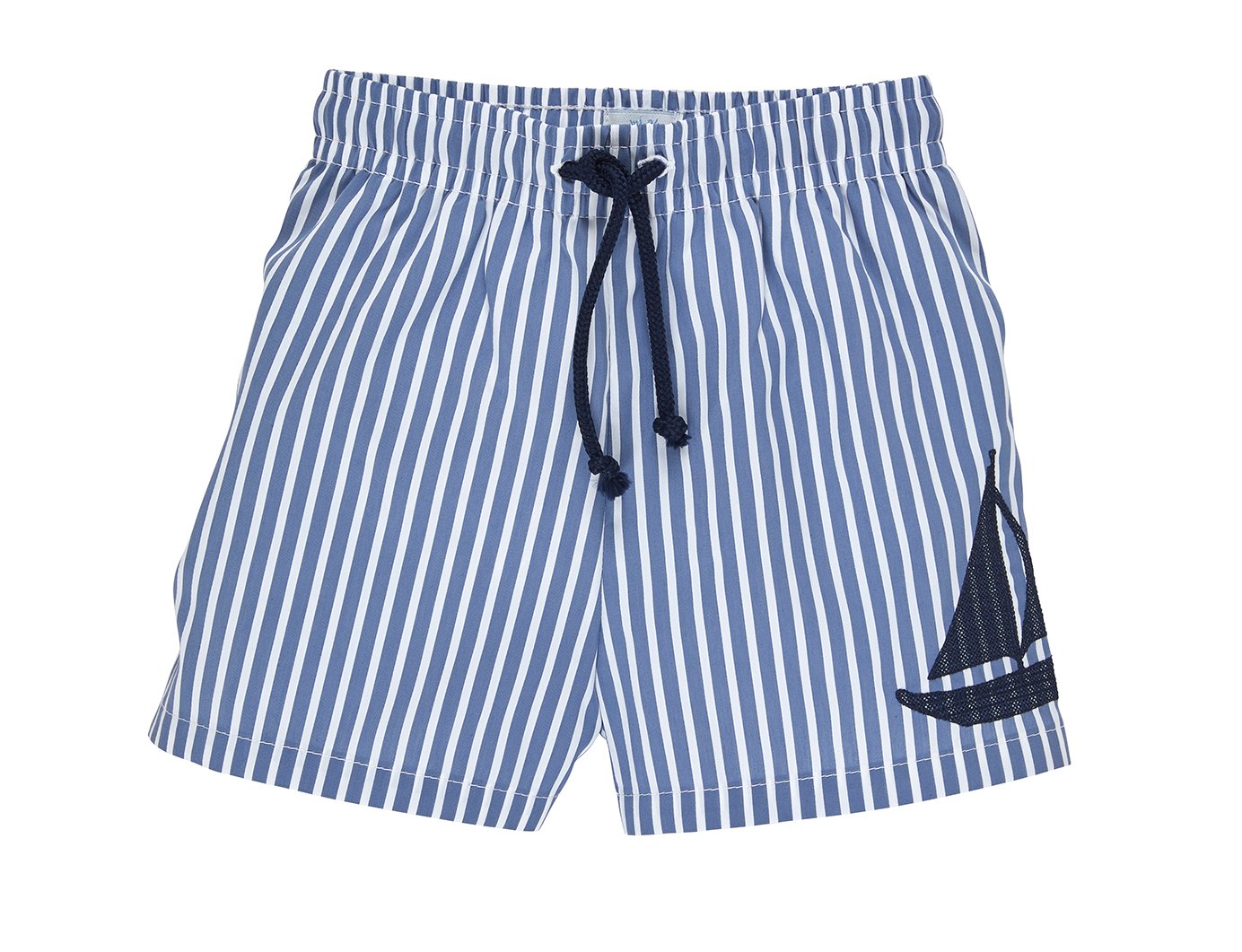 blau gestreifte Bade-Shorts mit einem gestickten Segelboot mit Netzhosen-Inlay, Gummizug und Bändern