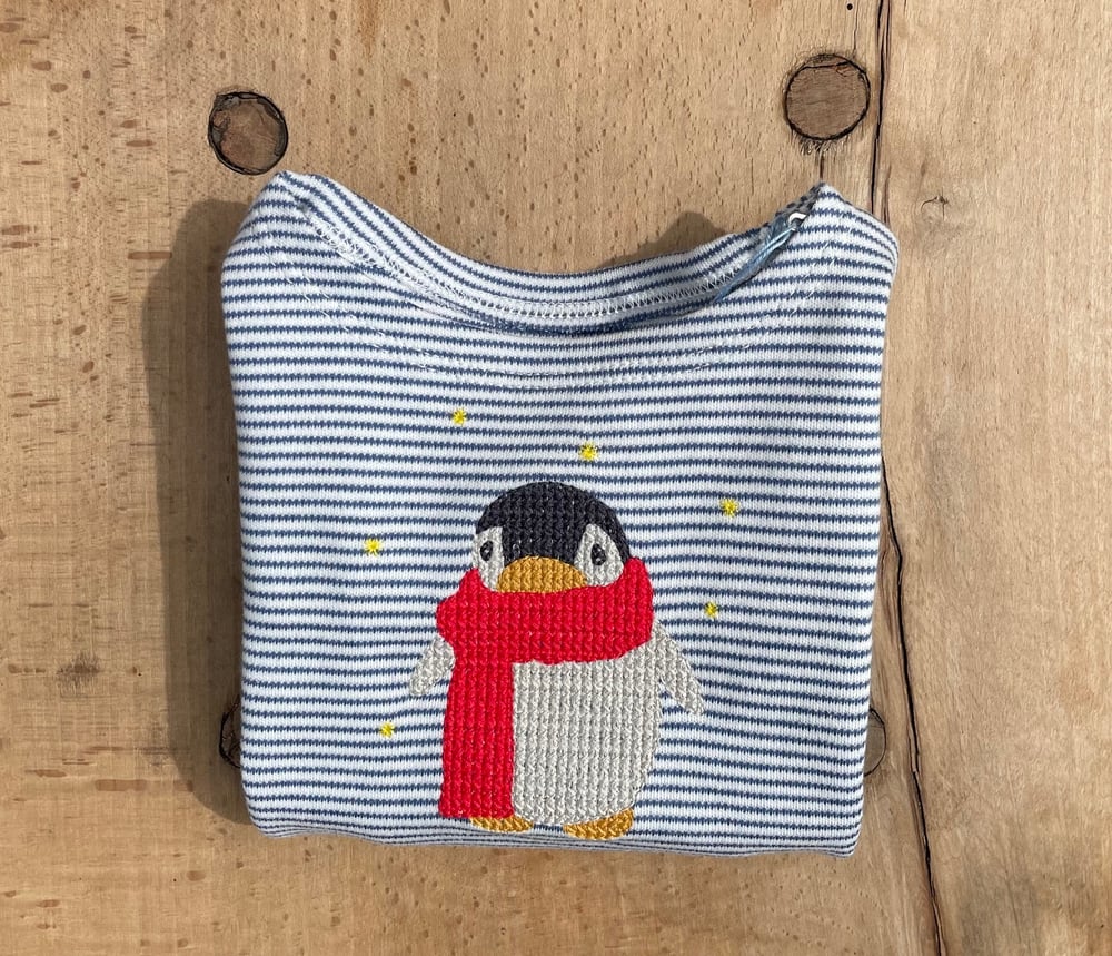 Blau gestreiftes Shirt mit einem gestickten Pinguin