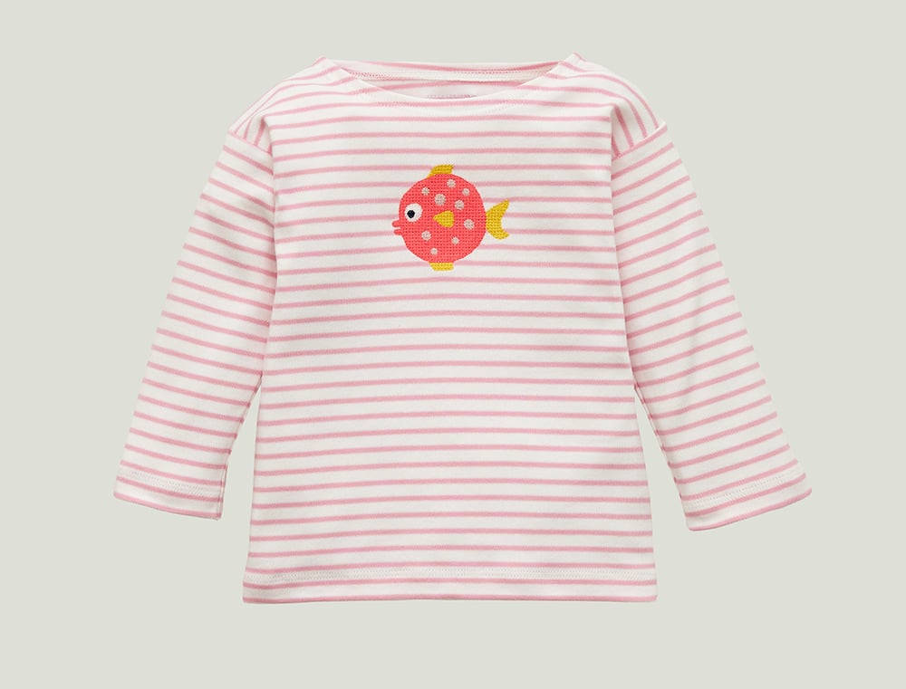 rosa gestreiftes T-Shirt mit einem gestickten Fisch